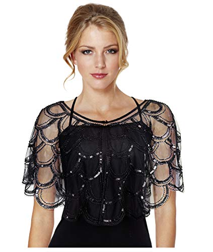 Keland - Scialle da donna, in stile vintage anni ‘20, con paillettes, mantellina da sera con lustrini, per matrimoni e feste Nero Taglia unica