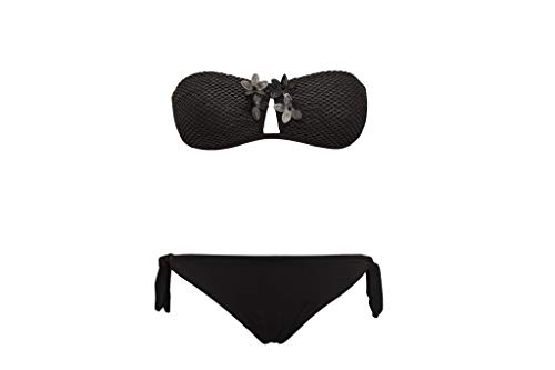 Verdissima, Bikini a Fascia con Imbottiture Estraibili e Slip Annodato, Rete di Fili Lurex Argento sulle Coppe, Fiori in Ecopelle Tagliati Laser, con Stecche Laterali, Colore Nero, tg. 2